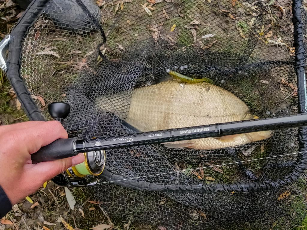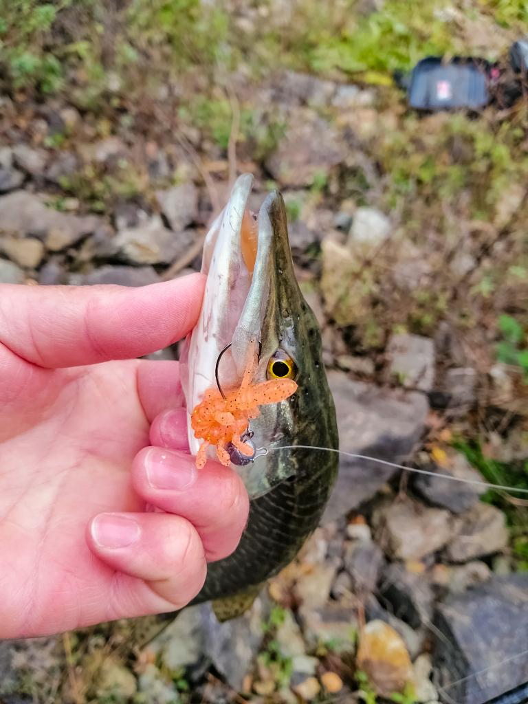 След емоцията с тази фейк щука се насочих към по-лекия джиг и дръпнах едно костурче на силиконова ларва 2.5 инча от ямата където, хвърляше Станимир.