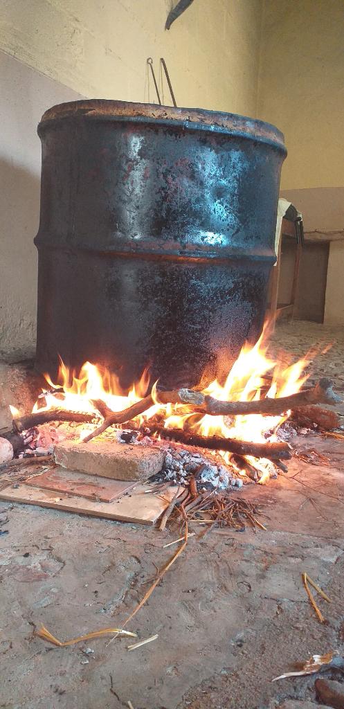 Con el trigo y el maiz en nuestras manos nos fuimos a la deshabitada casa de la bisabuela de uno de nosotros, donde había una antigua cocina de lumbre. Como comprendereis, cocer en cocina de butano o vitroceramica semejante cantidad de grano se haría increiblemente lento, amén de una factura y gasto importante😅, por lo que lo más coherente hacer un fuego y cocerlo allí. Así que una casa con cocina de este tipo era perfecta para poder hacer lumbre sin riesgo y sin que nos mandasen a tomar por saco por calentar la casa ni nos multasen, dado que estabamos a mediados de agosto con treinta y pico grados 😅