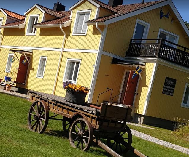 Stugorna är utrustade med ett litet kök med rinnande vatten, kyl, micro, kaffebryggare och vattenkokare. Två våningssängar med kuddar och täcken, bord med stolar både inne och ute samt LCD-TV. Grillplats och WiFi. Mat lagas i servicebyggnaden.